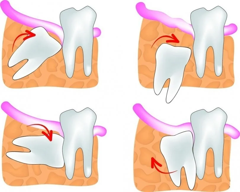 Crecer derecho hacia arriba o hacia abajo, como cualquier otra muela, pero permaneciendo atrapada dentro del maxilar.